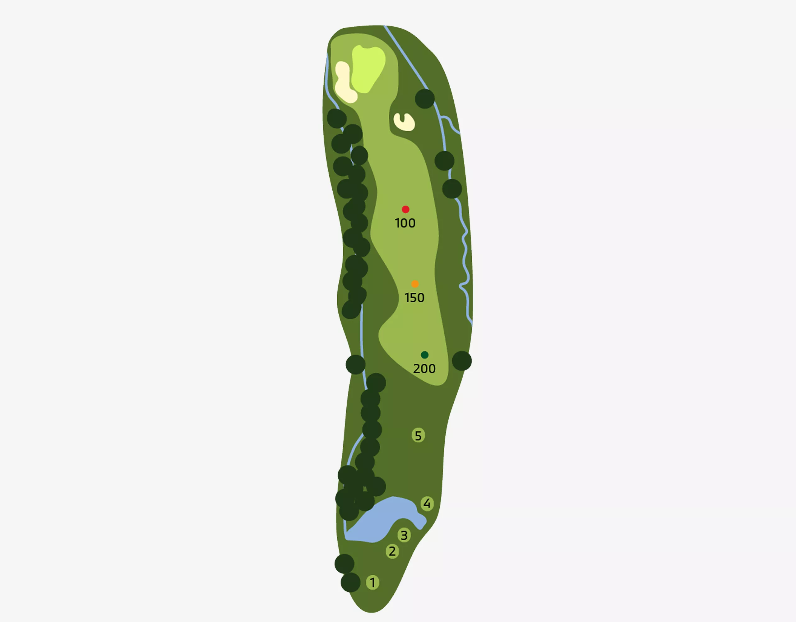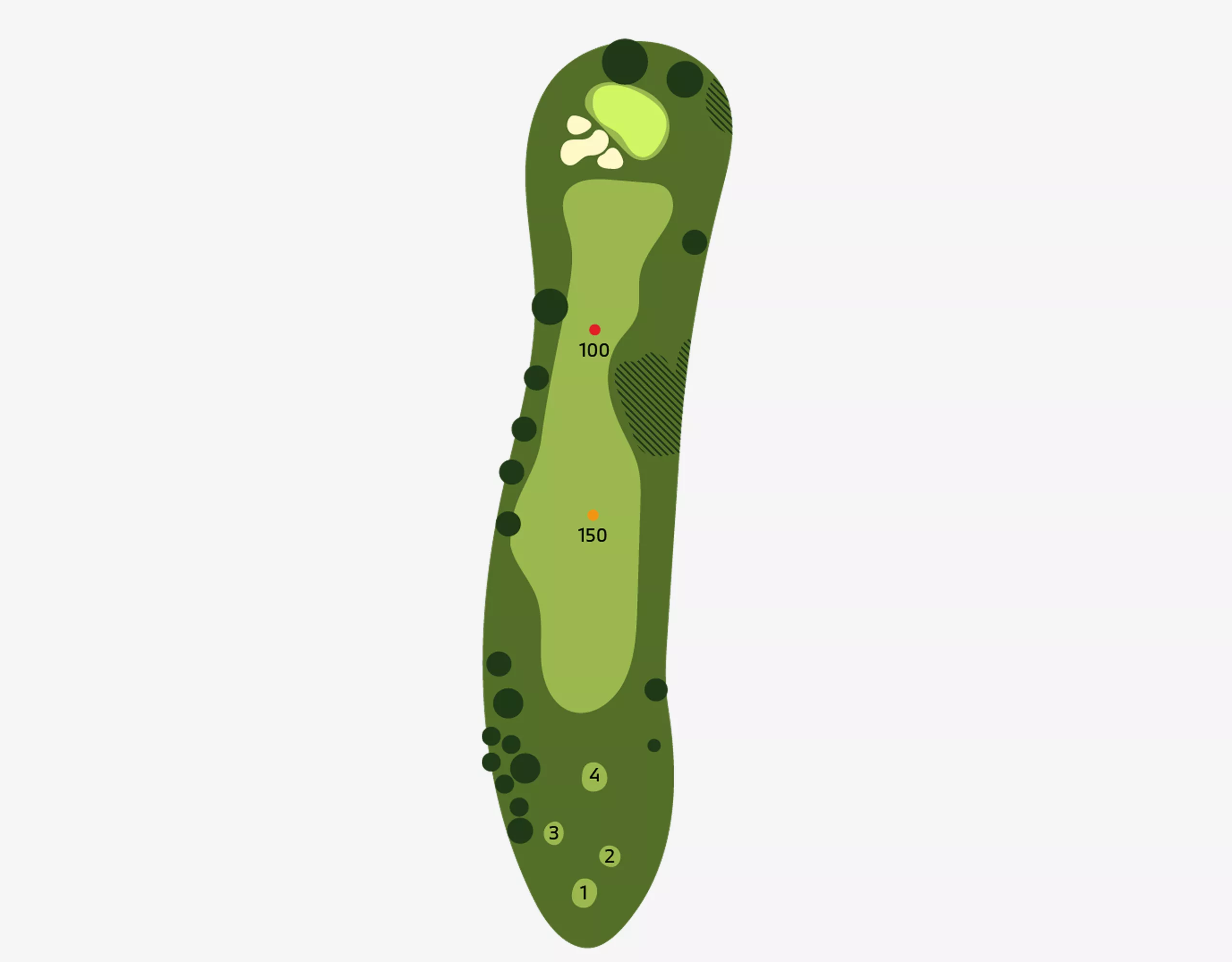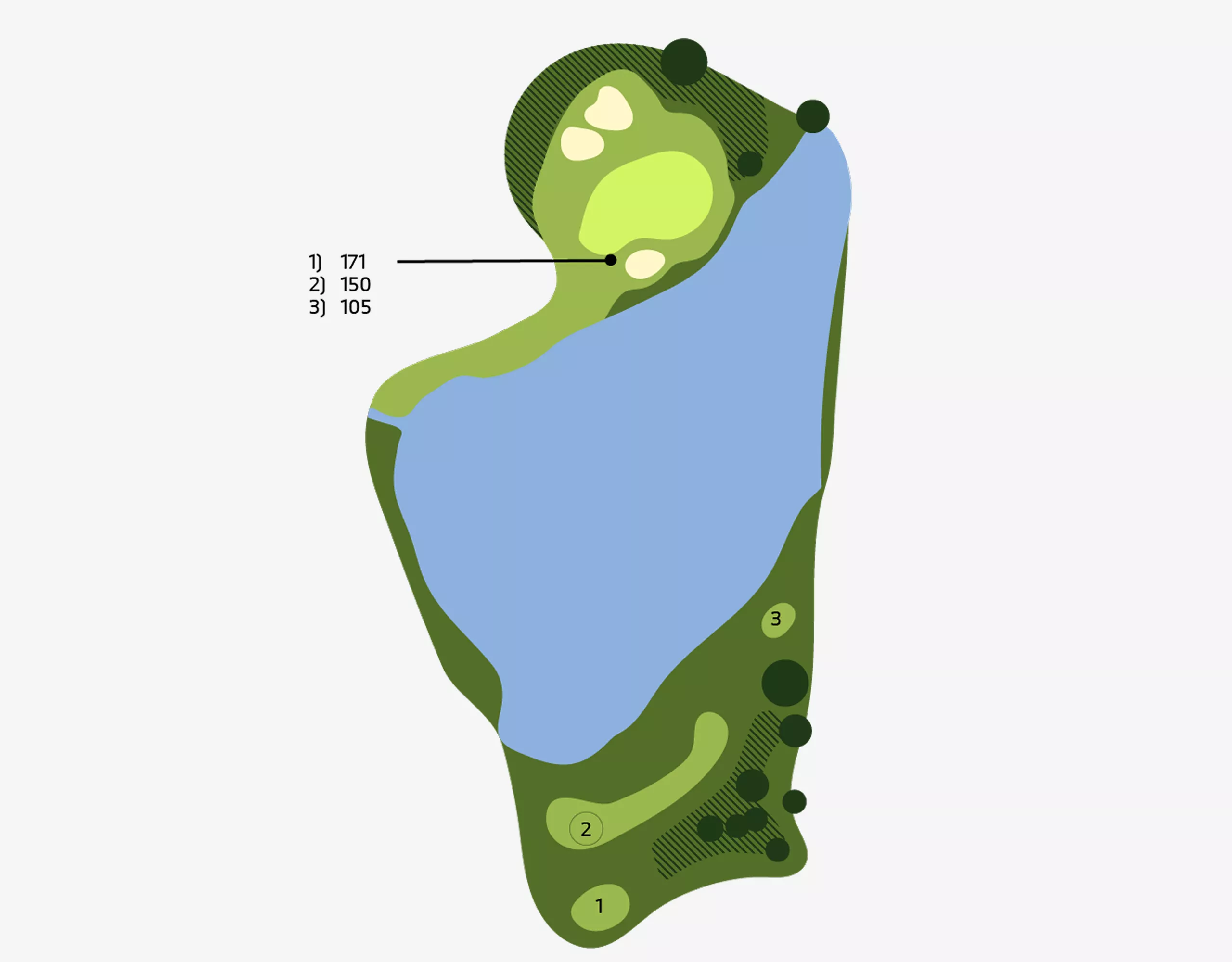 Left here is trouble! Do not be suckered into firing at the pin if it is placed on the left side of the green. Balls that pitch on the right half of the green will tend to feed left, so this is the smart play.